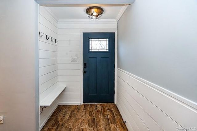 Welcome to this charming 3-bedroom, with a bonus room well maintained beautiful home on a corner lot offering an ideal blend of classic character and modern comfort. Bathed in natural light from its favorable southeast-facing exposure. The main level features rich hardwood oak flooring throughout creating a warm and inviting atmosphere from the moment you enter. The spacious living room showcases a distinctive horizontal shiplap wall panel, a wall air conditioning unit, while the dining room presents beamed ceiling and provides an elegant and modern setting for entertaining. The open-concept kitchen is appointed with granite countertops, and a breakfast bar. The upper level has the primary bedroom, and two additional bedrooms and offer a fully renovated bathroom with double vanity and hardwood floors and access to a crawl space for added storage. The lower level has a media/den room with a decorative fireplace & built in bookcases, a bonus room that can be a gym, office or extra bedroom and a powder room. The auxiliary/laundry room has the washer and dryer, boiler, hot water heater, electrical panel 200 amps, and hardwood floors throughout, and a separate entrance that leads to the large fenced in backyard with a patio and a fire pit perfect for entertaining as well as a shed for gardening tools.