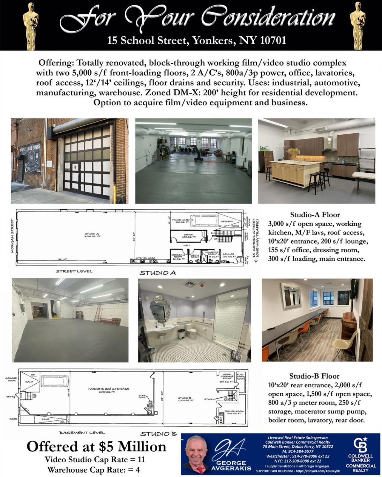 PRICE REDUCED!! GET OUT OF NEW YORK CITY! - LESS THAN 2 MILES OUT! - REDUCE OVERHEAD NOW!Here's a great opportunity of obtain a profitable mutlifunction property with the following unique advantages:1. Two 5,000 s/f industrial strength floors with separate semi-tractor trailer entrances on opposite sides of the block for each floor.2. Enough power for a DATA CENTER/SERVER HUB 1.8 miles north of New York City's boundary! 3-Phase 800 amp, in-house with two Con-Ed transformers on street poles.3. Yonkers Zoning is DM-X: Develop up to 200' of vertical floor space (+90,000 s/f)4. New industrial gas line for HVAC: 7-ton and 12-ton rooftop units can cool a meat locker!5. Currently used as two TV production studios, owner is amenable to purchaser acquiring film/video equipment for a negotiable sumSeeking Residential Opportunities?Consider a DM-X zoned residential build-up with parking on the two lower floors. Assuming 10' floor allowance, add 18 floors of 5 apartments each. totaling 90 units! Rented at market rates of $2,000/m = $2.16M/yr. plus income from the two warehouse floors for parking. This building is also key, center, block-through property for an entire block assemblage, providing high resale value if left as-is and sold as an anchor.Recent developments by a hospital across the street, and the impending development of the 'Chicken Island block, 100' to the north (next to City Hall), make this property is a very smart move.Come see any time from 9 to 5 Monday through Saturday. Additional Features: Two concrete, heavy duty floors capable of taking and parking commercial trucksRenovations within the last 8 years: New Con-Edison electrical installation, fire and security alarm system, HVAC system including boiler and two roof-top A/C units.New sewer and sump pump with maceration New roof surface - walk-on capable