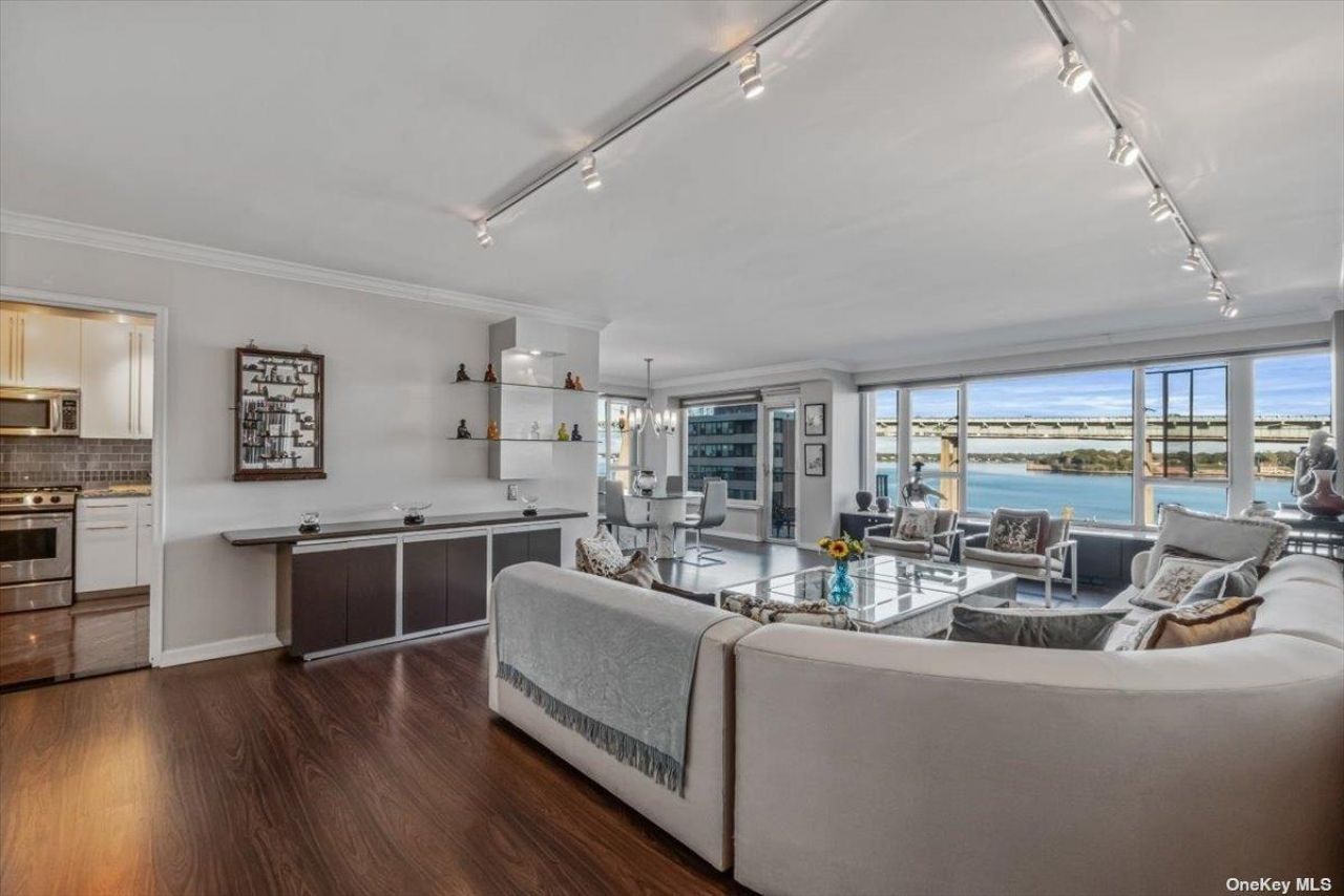 One of a Kind 4 bedroom converted to a 3 bedroom 2 bathroom unit in a full service luxury building. 2,200 square ft corner apartment with water views, new kitchen & bathrooms, wood floors throughout, tons of closets, huge living room/dining room that goes out onto terrace. Laundry room on every floor. Amenities include 24-hour doorman, 24-hour gated community, 24-hour valet parking, inground heated pool, recreation room that can be rented out for a fee, gym, library, storage unit, bike room and beautiful landscaped grounds. Express bus & NYC buses across the street.