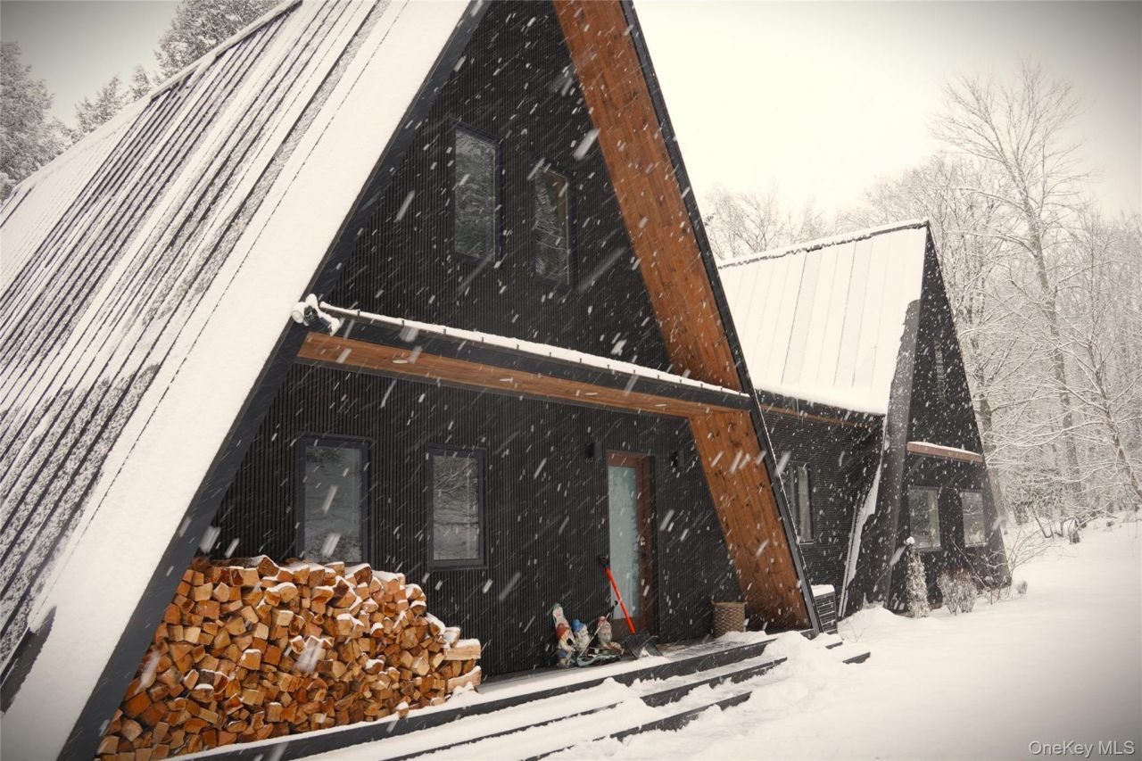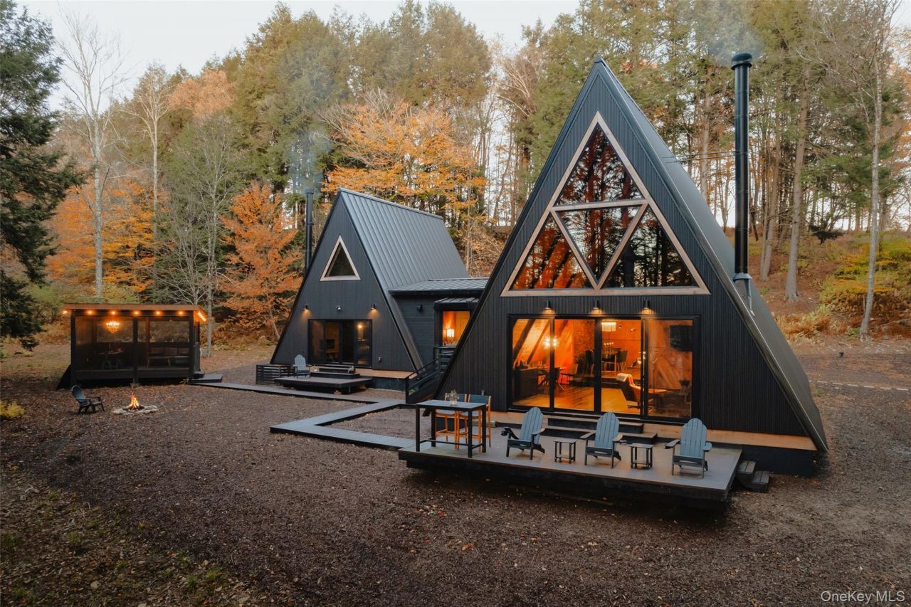 Escape to your own private woodland getaway in this striking double A-frame home, custom-designed by a local builder known for creating spaces rich in character and textures. Nestled on a secluded, lakeview-wooded lot, PerryWood exudes the charm and warmth of a classic A-frame, but delivers the space and comfort of a full-size home with 3 bedrooms and full baths, a chef's kitchen, 2 dining spaces, loft office, yoga studio, equipped gym, screen room, and two back decks. The large unfinished basement provides opportunity for additional expansion of living space. Built in 2021, Perrywood is offered with most of its furnishings which have been creatively curated to complement its unique design. Two hours from NYC and minutes to Bethel Woods Center for the Performing Arts. This is a lake view not lake front property-- there is NO RIGHT OF ACCESS to the private lake.