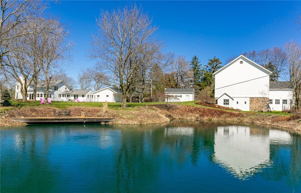 This is it! The estate you've been dreaming of. The one you've admired and imagined as your own. A rare opportunity in the heart of Pittsford, this c.1810 Federal-style farmhouse rests on nearly six private acres with sweeping views, a tranquil pond with dock, tennis/pickleball court, and a remarkable historic barn. A property of this scale, setting, and seclusion is seldom offered. A winding, tree-lined drive introduces expansive lawns and park-like grounds, revealing a home that blends original character with modern refinement. A 2021 stunning renovation by Martin and Company thoughtfully reimagined the main living spaces with high-end finishes, professional-grade appliances, and timeless design. Every room is oriented to the landscape, where natural light and long views define daily living. Behind its timeless facade, the property has been reengineered for the next owner and the next century. Structural reinforcements, upgraded systems, modern utilities, and advanced water management provide lasting strength, comfort, and peace of mind, preserving the home while preparing it for generations ahead. The grounds are exceptional. Open fields, mature trees, vegetable gardens, fruit trees, and grapevines create a layered landscape. Deer, Eastern Bluebird, the occasional Blue Heron, and Red Fox move through the property, enhancing the sense of quiet immersion in nature. Two sides border protected land, reinforcing a rare level of seclusion in this location. Anchoring the estate is a structurally reinforced barn, a versatile space reflecting the property's heritage and possibility. With two full levels, it offers expansive room for entertaining, creative pursuits, or equestrian use, with stables and storage below. It is the kind of space that invites imagination and adapts to the life its next steward envisions. Completely private yet remarkably connected. The Village of Pittsford, top-ranked schools, and Rochester are just minutes away. This is not simply a home. It is a legacy property defined by land, light, and quiet presence in one of Pittsford's most sought-after settings. Delayed Showings begin 4/7; delayed negotiations on 4/17 at Noon.
