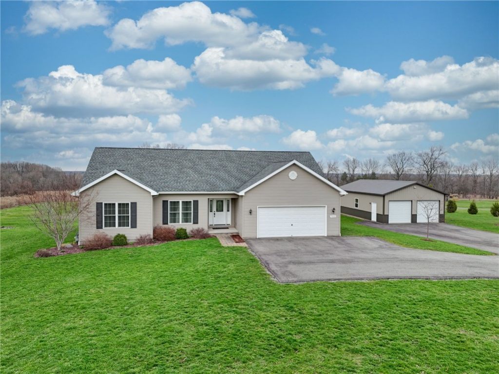 Country Living at Its Best! Set on 2.68 acres, this well-maintained home offers the perfect blend of space, comfort, and functionality. Step inside to a bright, open living room featuring vaulted ceilings and a cozy gas fireplace-ideal for both everyday living and entertaining. The kitchen has been thoughtfully updated with new Corian countertops and sink (2025), complemented by luxury vinyl plank flooring for a modern, durable finish. Additional highlights include a 12-course basement providing excellent ceiling height and potential for future finishing. Outdoor features truly set this property apart! Enjoy the 12x20 vinyl/composite deck (2019) overlooking your expansive lot. Car enthusiasts, hobbyists, or those needing extra storage will love the 2-car attached garage plus the impressive 24x40 pole barn-complete with two overhead doors and a rear access door for added convenience. Recent improvements include a newly paved driveway (2025). This Energy Star home also offers public water and the bonus of free garbage service. Move-in ready with many updates already completed-see attached list for more! Meticulously maintained and built! A rare opportunity to enjoy peaceful country living with modern amenities! Delayed negotiations through April 14th at 5PM. Please give 24 hours for response to all offers. OPEN HOUSE SUN 4/12 from 1-3 PM.